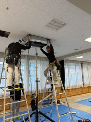 大型の業務用エアコンを慎重に天井へ吊り込み中。