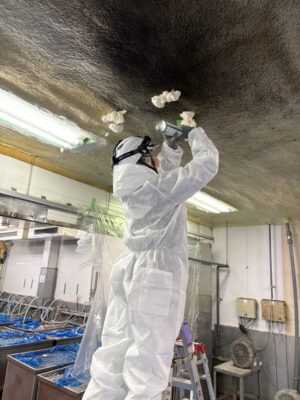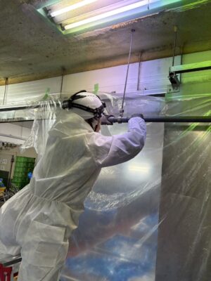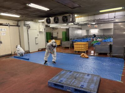 床全面をブルーシートで覆い、作業エリアと非作業エリアを明確に区分。
