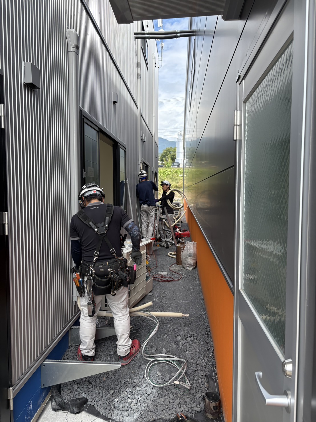 こんにちは!本日は東御市某新築工場事務所棟空調設備工事の様子をアップさせていただきます。作業写真は室外機周りの仕上げ工事となります。竣工までもう少しですが、最後まで気を抜かず、完了まで行きたいと思います。