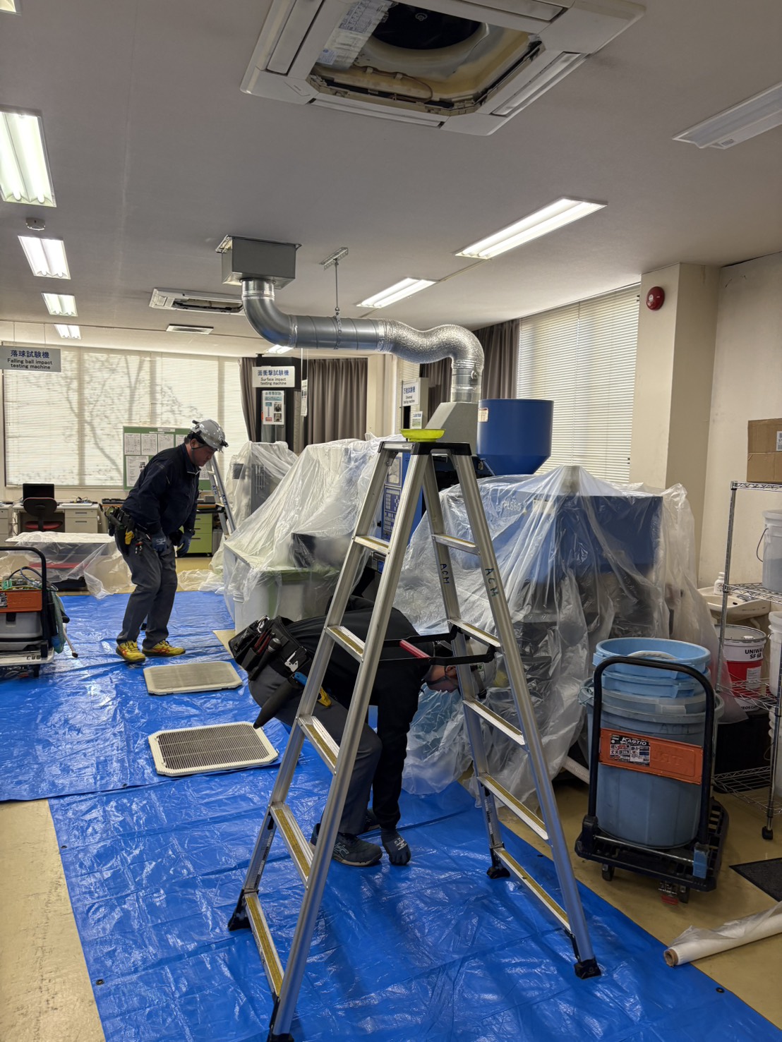 上田市某工場にて、業務用空調機の洗浄メンテナンス作業を実施しました !作業前には機械・床・周辺設備をしっかり養生し、工場内への影響を最小限に抑えます 。天井埋込型室内機を分解し、熱交換器・ファン・ドレンパンまで丁寧に取り外し 、高圧洗浄により、内部に蓄積した油汚れや粉塵を徹底的に除去しました 。洗浄後は各部品を確実に組み立て、試運転・風量・排水状況を細かくチェック 。空調性能を回復させ、工場内の快適性と衛生環境の向上につながる施工となりました 。