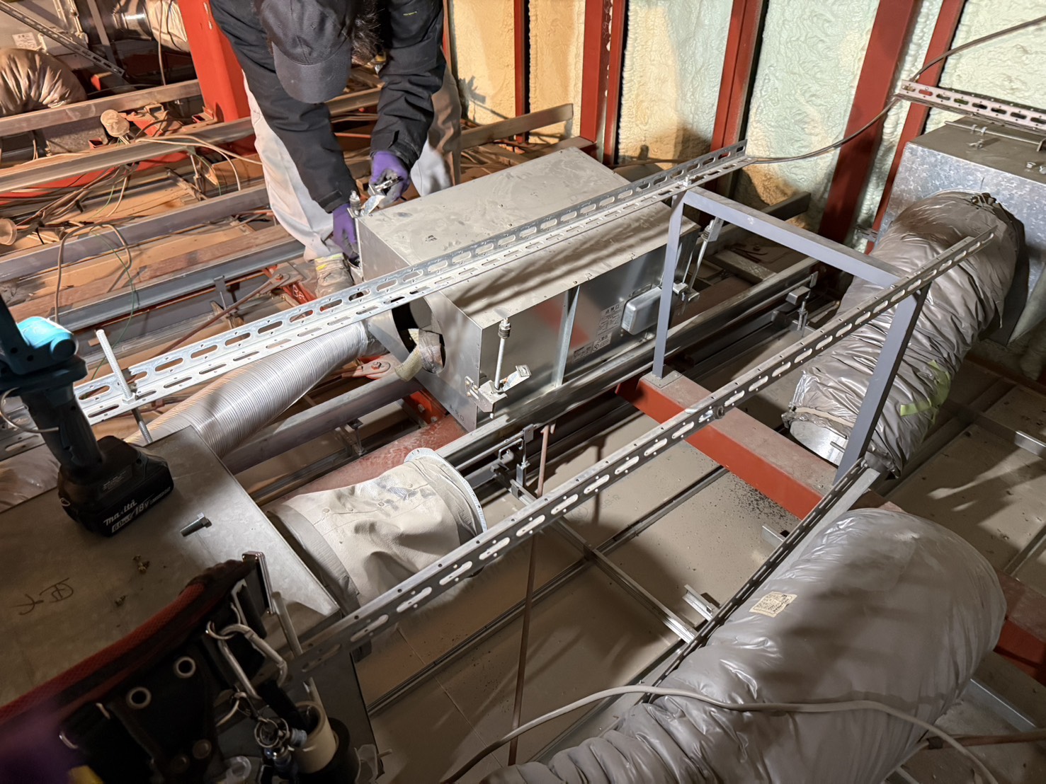 既設機器の撤去後、ダクト接続部および支持金具の状態を確認し調整を行いました。